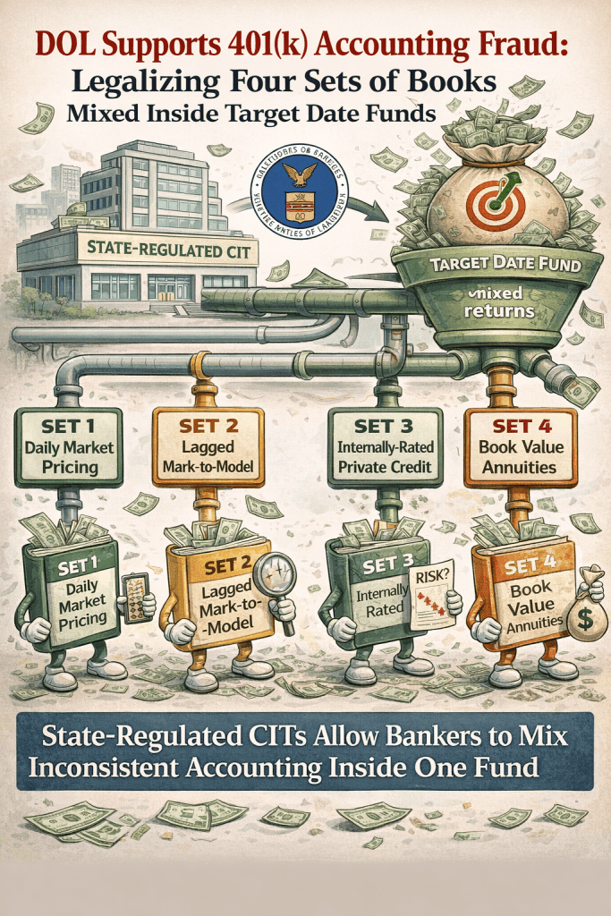 The Department’s proposed rule effectively legitimizes opaque investment structures in 401(k)s that obscure true economic value and risk and violate basic accounting standards. By encouraging use of Private Equity, Private Credit, Crypto, and Annuities (with underlying private credit)—particularly through state-regulated collective investment trusts (CITs)—the rule permits commingling of assets subject to inconsistent valuation regimes, including book value, mark-to-model, smoothed returns, and market pricing. This creates multiple “sets of books” within a single target date fund, undermining ERISA’s core fiduciary duty of prudence and transparency. This proposal invites systemic mispricing, conflicts of interest, and prohibited transactions.