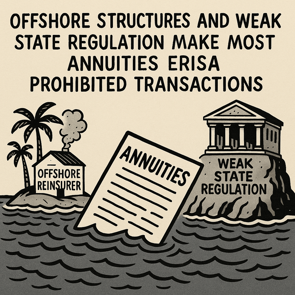 Billions of dollars in U.S. Retirement plans are in fixed annuities in 401(k) and 403(b), pension risk transfer annuities in Defined Benefit pensions, and other annuity and insurance products. The modern annuity business under U.S. life insurers is far removed from the stable, conservative guarantees many plan fiduciaries assume. A growing body of evidence shows that large life/annuity companies are off-loading liability, investing in opaque private credit, and relying on offshore reinsurance domiciles with lighter regulation. These structural features raise serious concerns for retirement plans subject to Employee Retirement Income Security Act of 1974 (ERISA) fiduciary and prohibited-transaction rules. In short: unless an annuity contract is carefully designed, it may expose the plan to a prohibited transaction or breach of prudence.