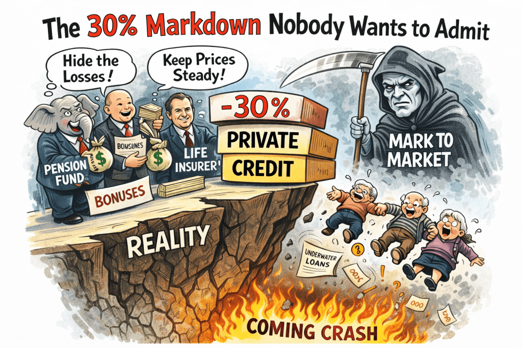 If private credit portfolios were forced into true market pricing today, the evidence suggests the haircut could easily approach 30 percent or more across many strategies. That number is uncomfortable, but it aligns with what secondary buyers are already implying and with the discounts required to move private assets in stressed conditions. The danger is not simply the loss itself. It is the delayed recognition.