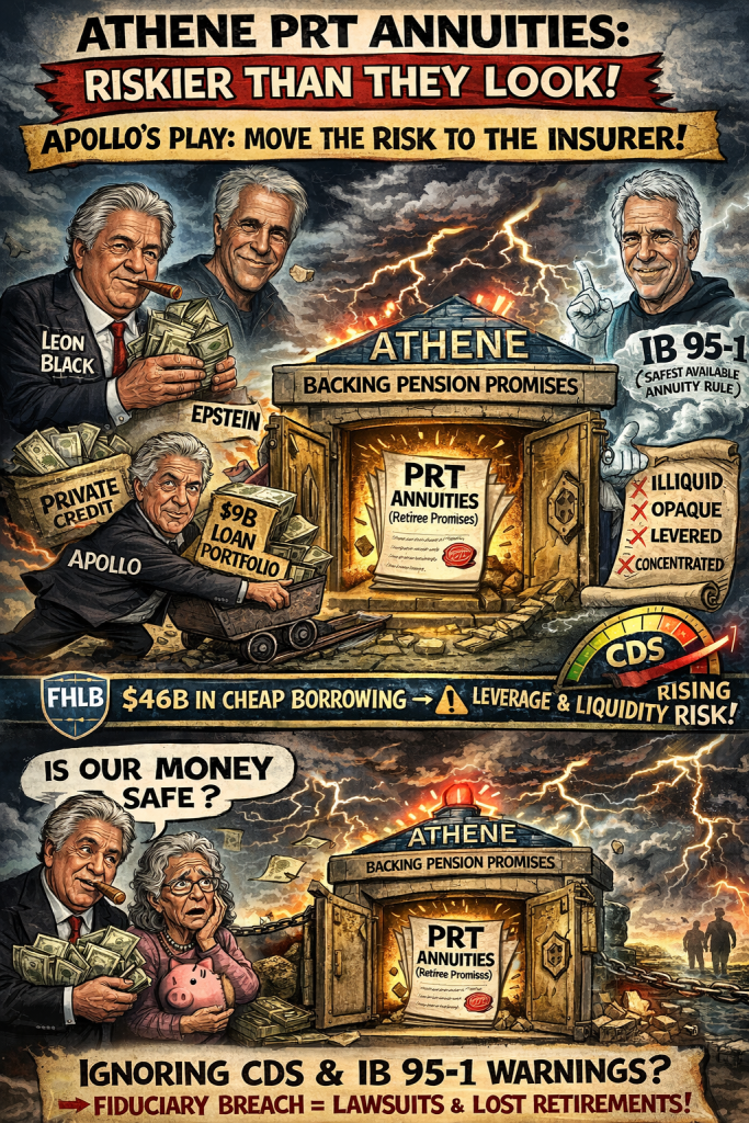 Apollo says Athene’s access to cheap government-backed FHLB funding makes annuities safer. In reality, it allows them to load more risk onto the balance sheet that retirees depend on. The $9 billion commercial real estate loan transfer isn’t a sign of strength. It’s a signal that the risks of private credit and real estate are being quietly shifted into the very entity that is supposed to guarantee pension benefits.